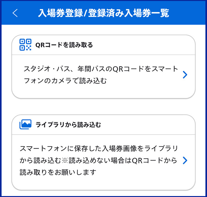 ライブラりから読み込むは、USJのWEBチケットストアなどで購入したチケットで表示されるQRコードを読み込む方法です。