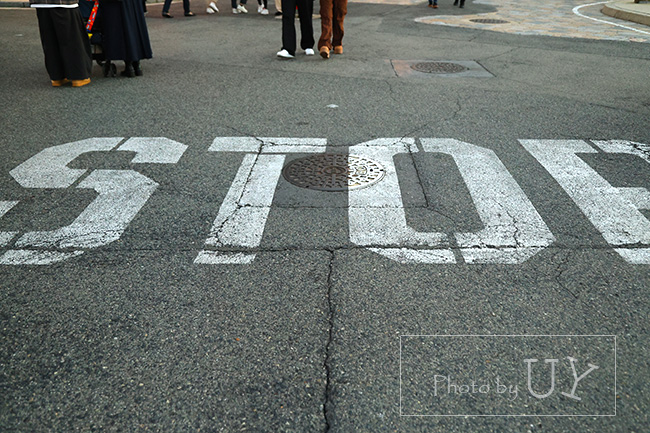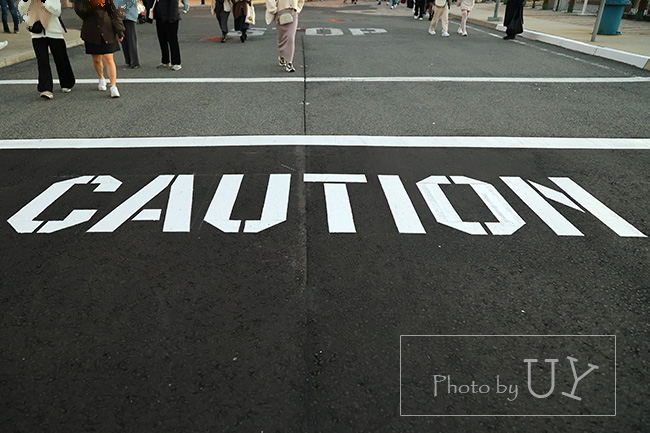 COUTIONと書かれた部分は新しいアスファルトが敷かれていて、白い文字がハッキリ見えます。