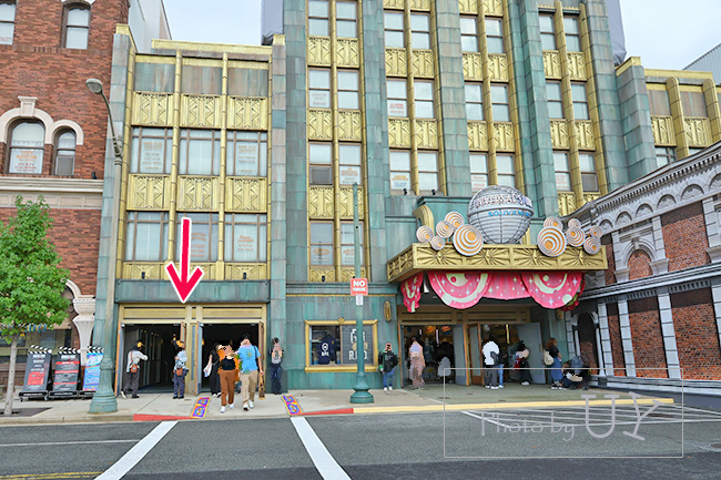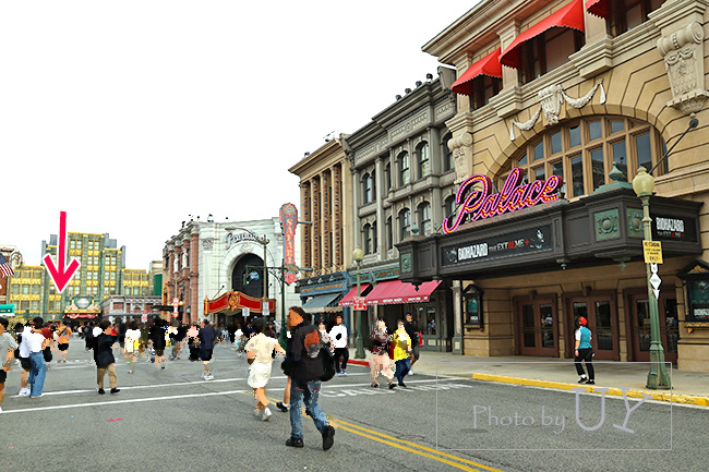 パレスシアターを基準にして整理券発行所の「ユニバーサル・スタジオ・スーベニア横」を示したのが下の写真です。