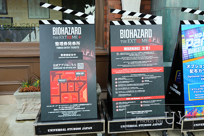 この写真を撮った日は、バイオハザードの整理券のみが発行されていて、ユニバーサル・モンスターズ~レジェンドは整理券なしで体験可能でした。
