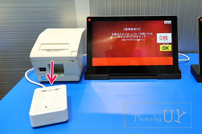 下の写真の矢印で示している端末にチケットや年間パスのQRコードを読み込ませることで整理券を取ることができます。
