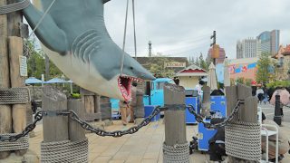 ジョーズのアトラクションのあるアミティビレッジに、捕獲されたジョーズのモュメントがあります。そこはフォトスポットになっていて、パークのカメラクルーがいるときは写真を撮ってくれます。これまでは手持ちのカメラで撮っていたのですが、下からあおるよ...