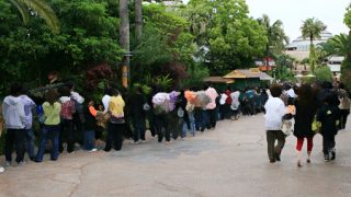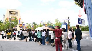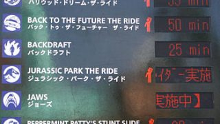 パーク内の3箇所に設置されているアトラクションやショーの待ち時間案内ボード。ここには次回ショーの時間やアトラクションの待ち時間が表示されていまして、時間を効率よく使うために利用する人がボードを見つめています。下の写真は、残念ながらお盆の待ち...