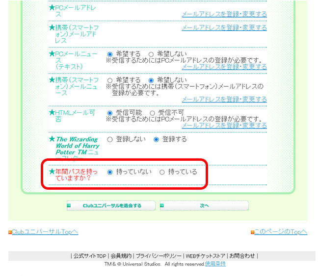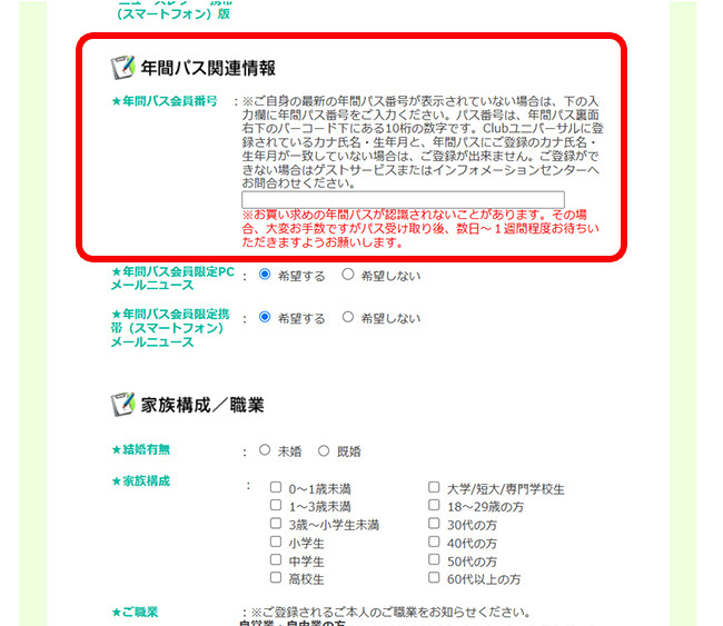 次のページで年間パス関連情報という項目があるので、ここに自分の年間パス番号を入力します↓