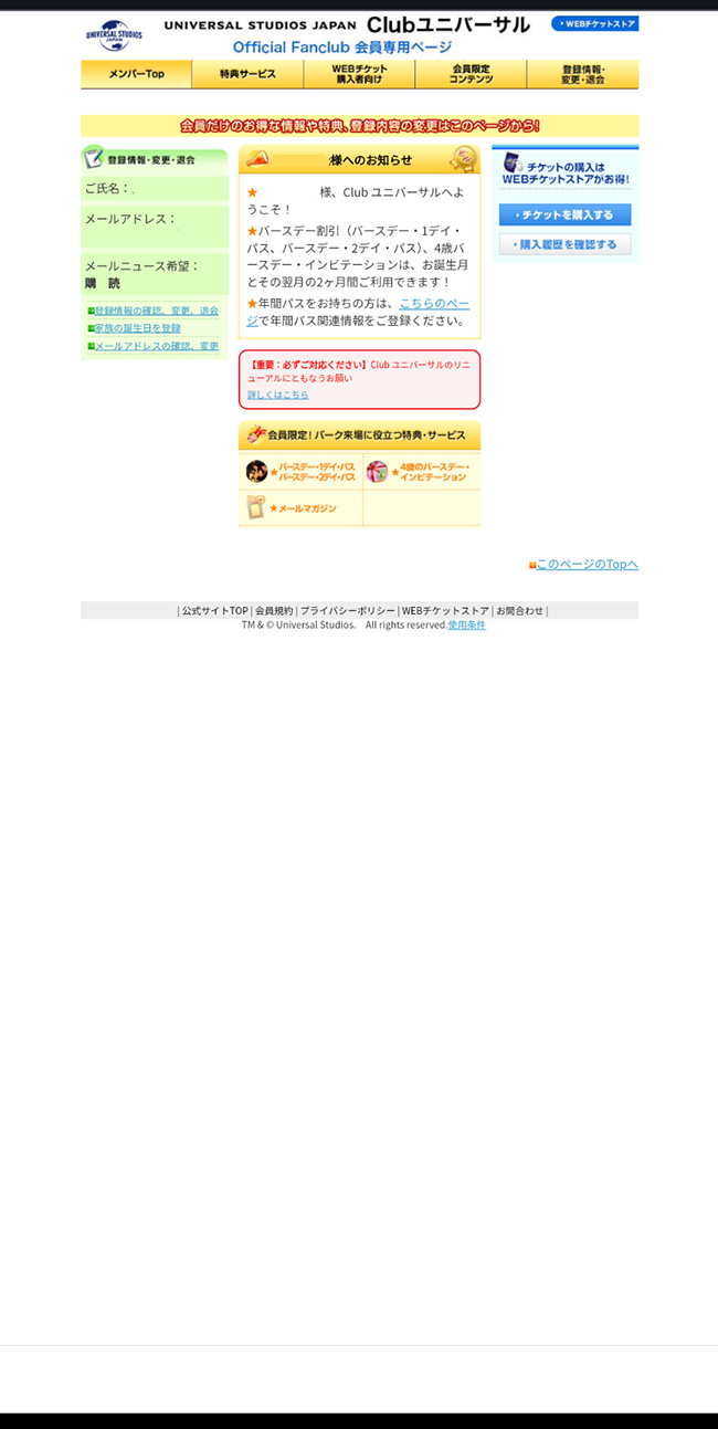 Clubユニバーサルのサイトは、USJ公式WEBチケットストアでチケットを買う際、必ず登録する必要があります。