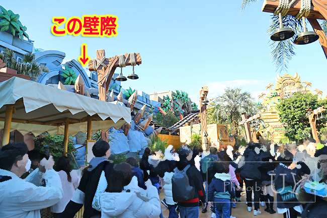 クレイジートロッコのレールとレールの間にあるスペースを待ち列として利用しています。