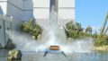 水しぶきが上がる中をライドが通り抜ける場面です。