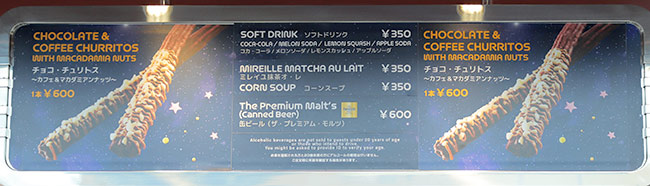 この写真は、上に貼ったストロベリーチュリトスが二つ並んでいるのと同じフードカートのメニューです。