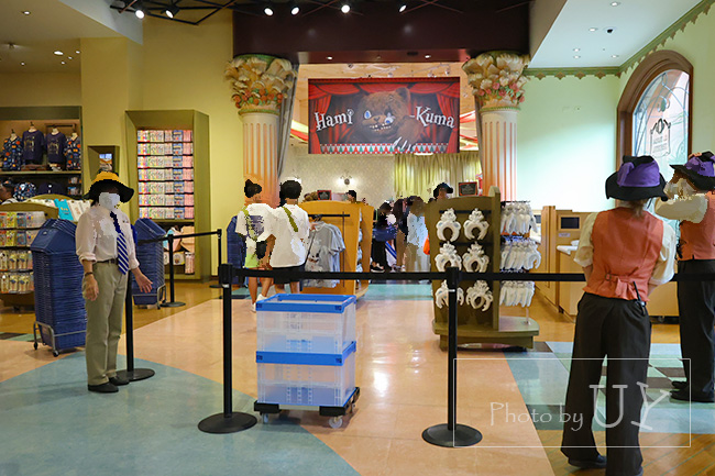 開園時間に近いタイミングでUSJに入ると、パークに入ってすぐ右にあるショップに行列ができています。