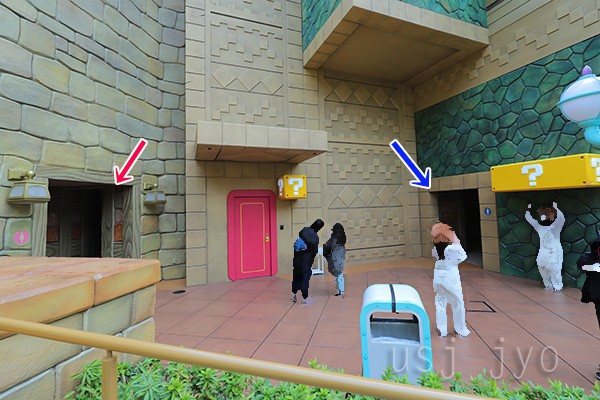 青い矢印のエレベーターは、マリオカートの入り口の前あたりに設置されています。
