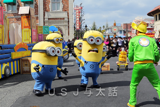 下の写真は、キャノピーと呼ばれるUSJに入ってすぐのところにある「大屋根」の下で行われている「ミニオン・スーパーグリーティング」に出てくるミニオンたちです。