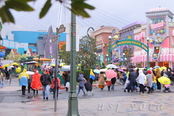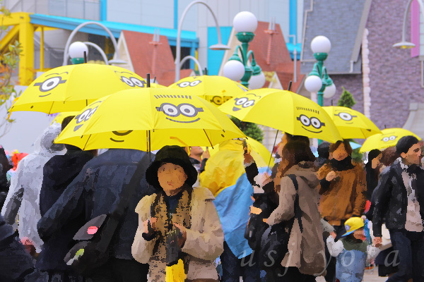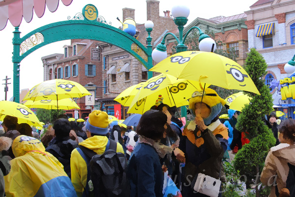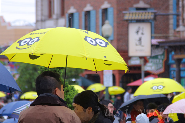 この写真を撮ったのがミニオンパークだったので、傘と言えばミニオンのデザインがされたものしか無かったのかもしれませんが、ミニオンパークの外であっても、ミニオン傘の割合はとても多かったのです。