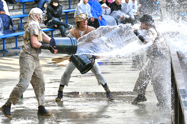 水上要塞を走り回るジェットスキー、ゲストの席までやってきて格闘するエンターテイナー。クライマックスではガスタンクが爆発し飛行機が着水。客席には炎の熱と大量の水が飛んでくる迫力満点のアクションショーです