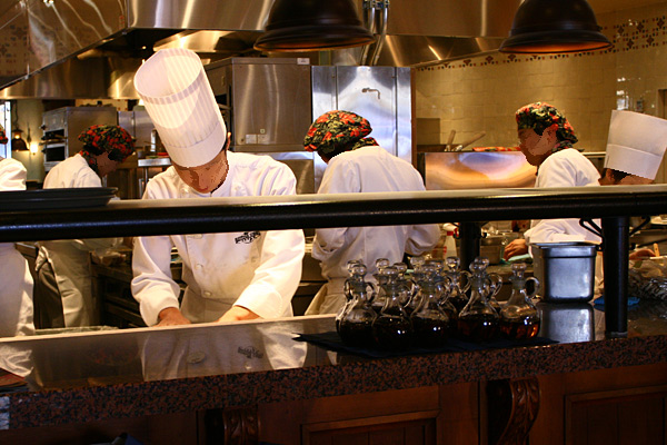ピザは手作りでして、この厨房では、ひっきりなしにピザを伸ばす作業をしておられます。
