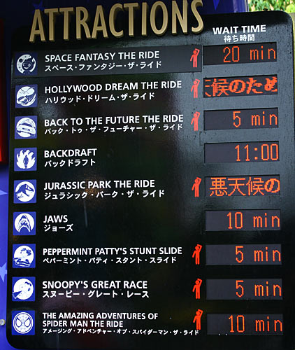このような待ち時間の案内をしているボードが、パーク内3ヶ所に