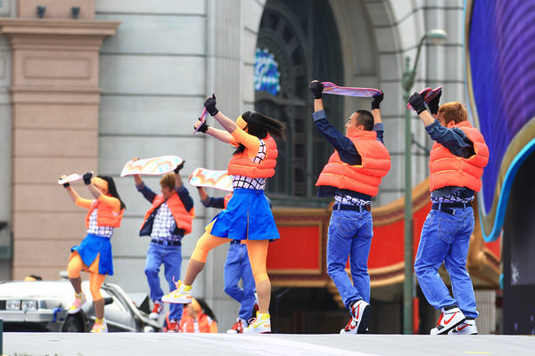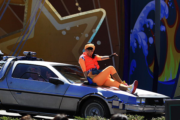 好きなもので、ダンサーさんがデロリアンのボンネットに座る