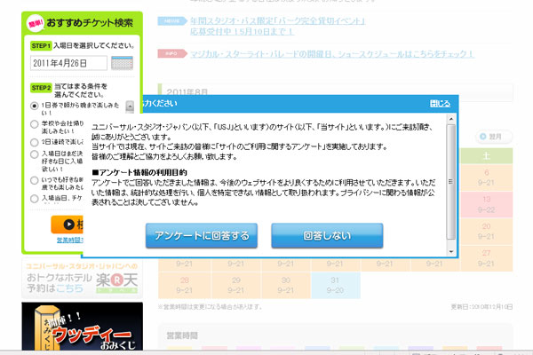 USJのサイトに戻ると、アンケートのウィンドウが開くことが2度ありました。
