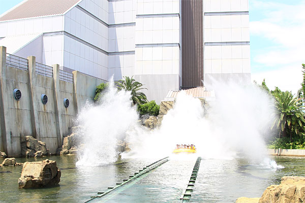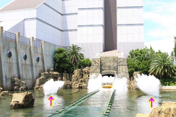 ライドが水の抵抗でブレーキがかかり、同時に水柱が立ちます