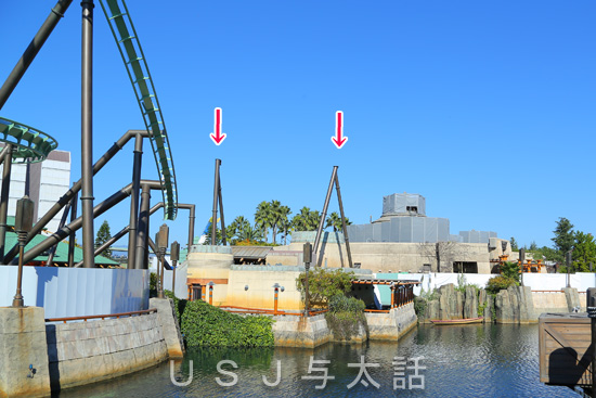 コースについても想像でしかありませんが、写真を撮ったジュラシックパークの端から、ラグーンに向かって伸びたレールが、 ファストフード店のフォッシル・フュエルズの横あたりからジュラシックパークザライドの着水地点の方向に向かい、ウォーターワールドのほうまで延びるんじゃないかと想像しています。