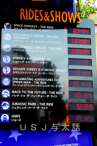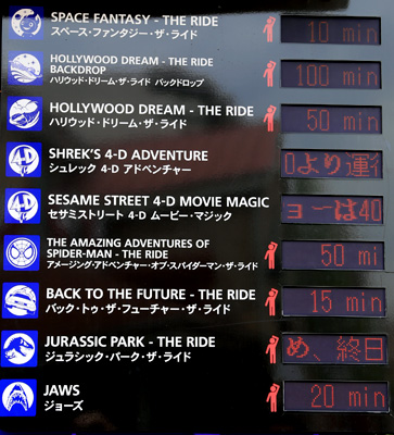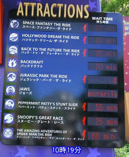 パークオープンから約30分ほどした時点のアトラクションの待ち時間はこんな感じです↓