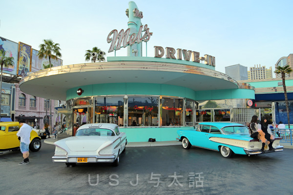 これはレストラン、メルズドライブインの前に停まっているアメ車です。