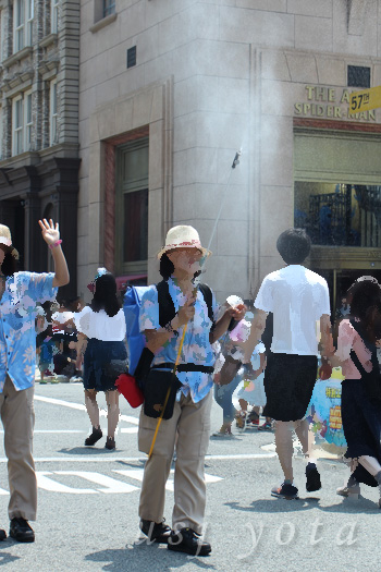 背中にタンクを背負って、左手でポンプを操作し、右手でゲストに向かってミストを吹きかけていました。