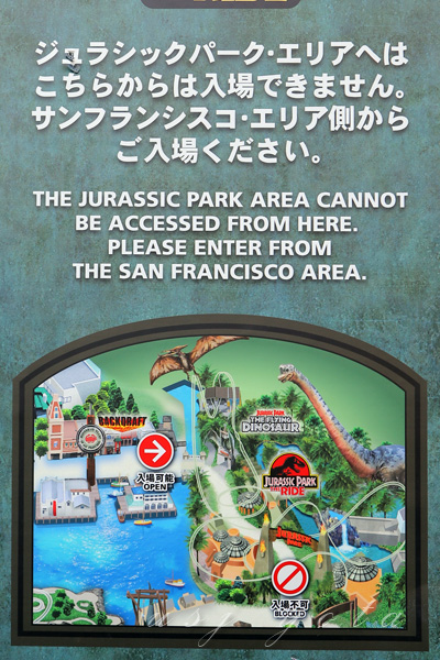 と思いつつ、パークを逆に回り裏側に行ってみたところ、ジュラシックパーク側も、ゲート付近で通行止めになっていました↓
