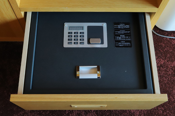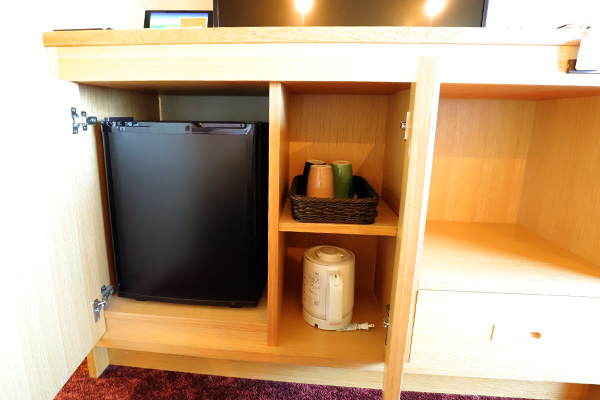 収納家具には、冷蔵庫・ポット・お茶セット・金庫が用意されています↓