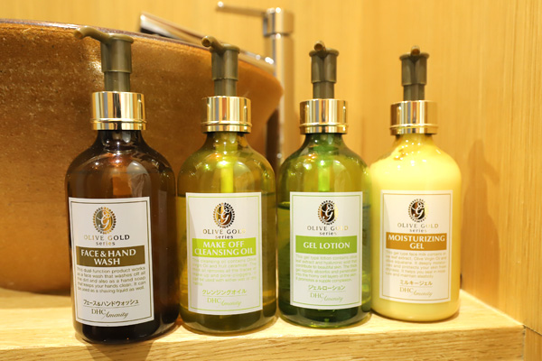 洗面の横にタオルやアメニティ、そしてハンドソープや乳液などが設置されています↓