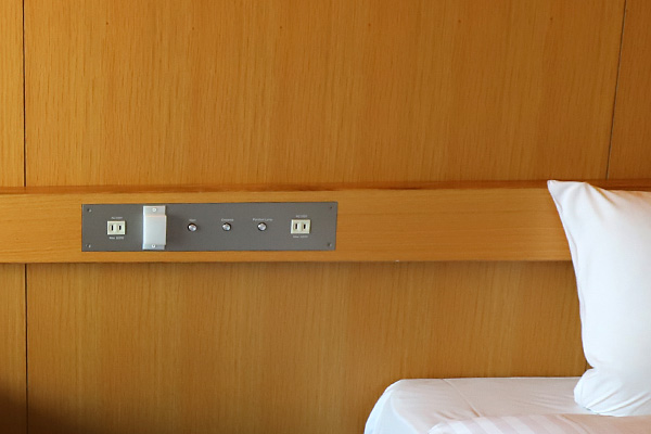 ベッドの枕元にコンセントが二つついています↓
