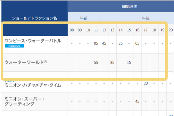 一番気になったのは、ウォーターワールドが終わってからゲストが出てくる時間と、ワンピース・ウォーターバトルのショー開催時間がダブったら大変やな。ということだったので、(一昨日の)ショースケジュールを確認してみました。