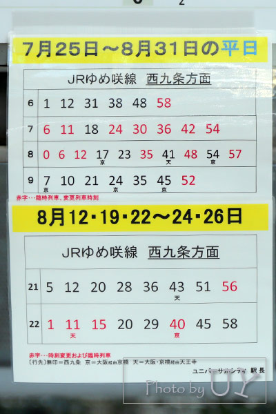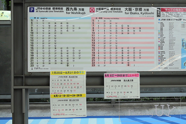 上に貼った写真はユニバーサルシティ駅から西九条方面(大阪駅方面)の時刻表です。