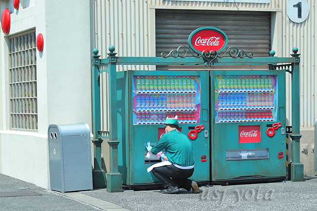 ドリンクの自動販売機で、ゲストが手に触れる場所を拭いているクルー