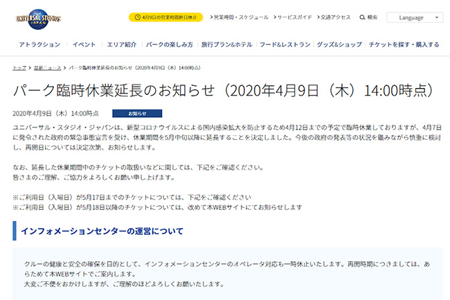 ユニバーサル・スタジオ・ジャパンは、新型コロナウイルスによる国内感染拡大を防止するため4月12日までの予定で臨時休業しておりますが、4月7日に発令された政府の緊急事態宣言を受け、休業期間を5月中旬以降に延長することを決定しました。今後の政府の発表等の状況を鑑みながら慎重に検討し、再開日については決定次第、お知らせします。