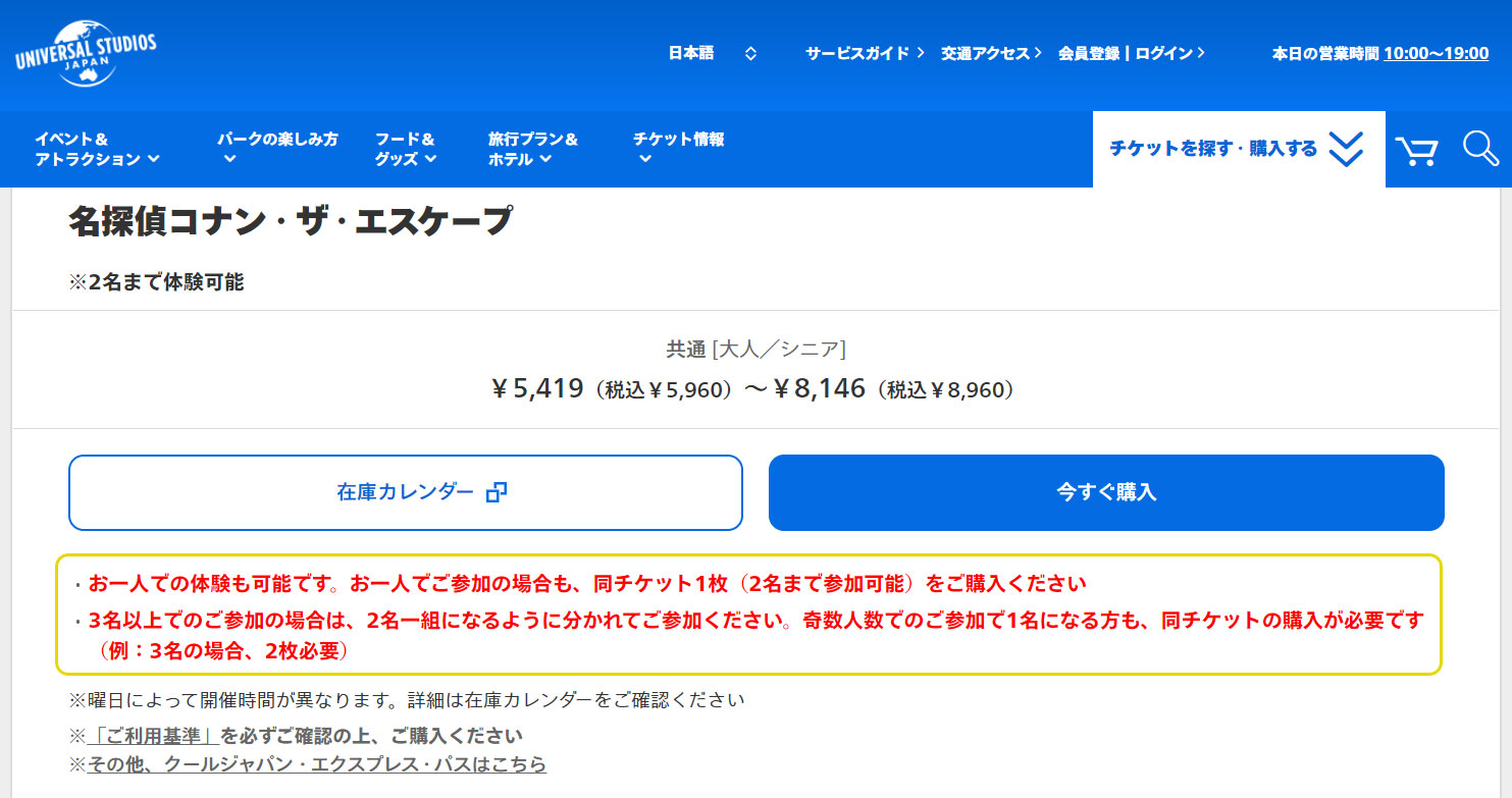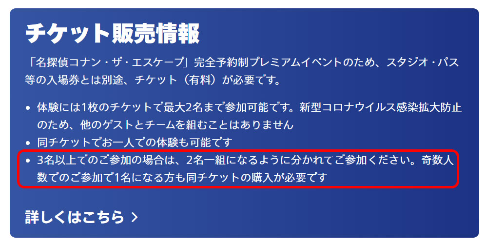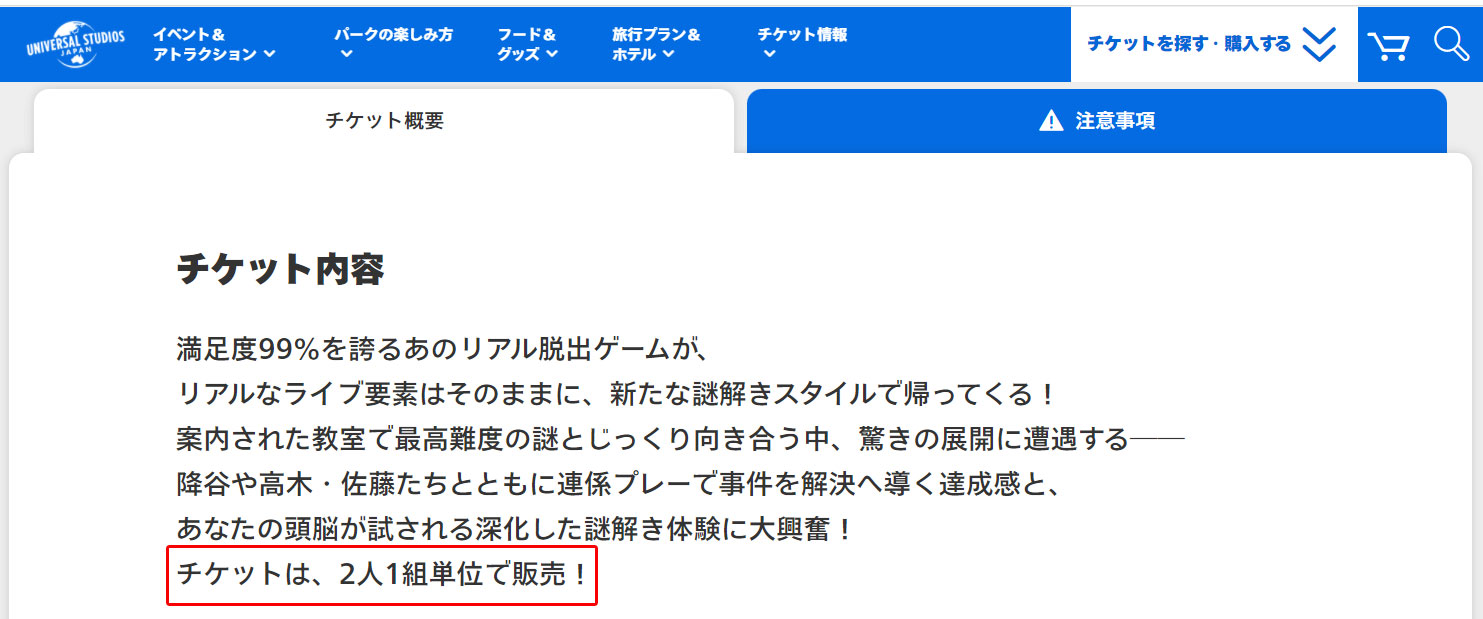 名探偵コナンザエスケープの紹介ページはもちろんのこと、USJチケットWEBチケットストアでもしつこいくらいに説明されていますが、このことを知っているから「しつこい」と感じるのです。