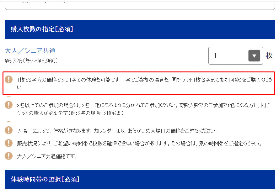 このような書き方ではなく、『1名様でも2名分のチケットが必要です』ハッキリと伝えるほうが良いと思うんですよね。