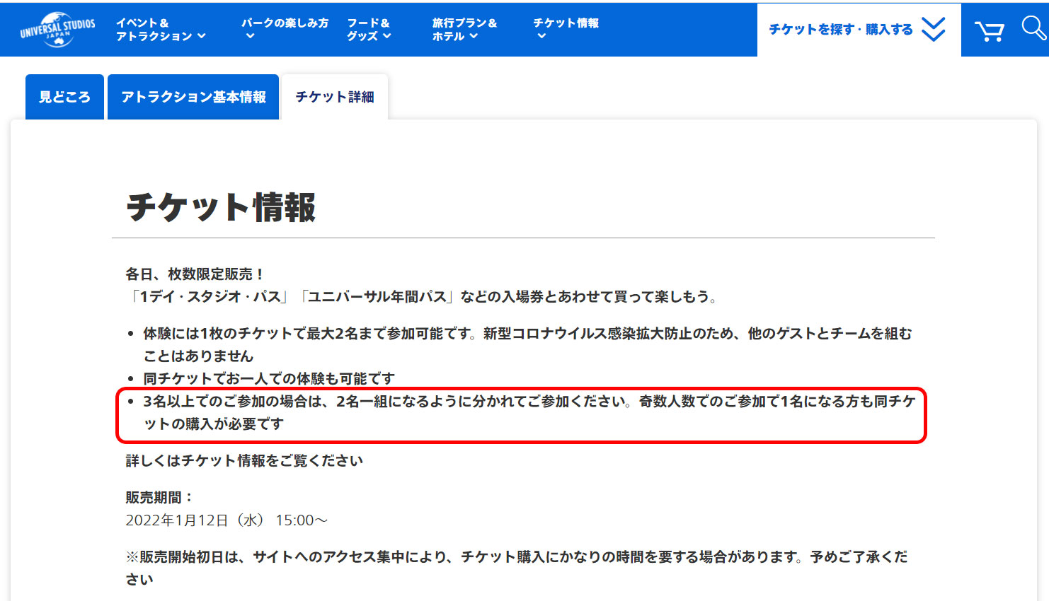 さらに言いますと、3人で参加したい場合、このチケットを2枚買って、2人一組と、1人のグループに分けて参加することとなります。