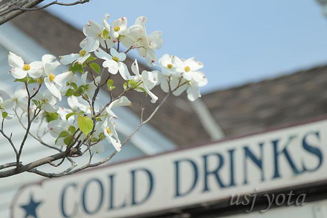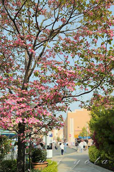 アミティビレッジのメインの通りにハナミズキの並木があり、遠目に見ると桜が咲いているようにも見えます。