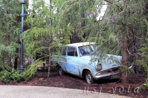 ホグズミード村の入り口の手前に、映画『ハリーポッターと秘密の部屋』に出てきた『空飛ぶ車』が落下したような状態で停まっています。