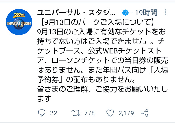 今日、2021年9月13日は、前日からUSJオフィシャルから、入場制限することを伺わせる旨の告知がされていました。