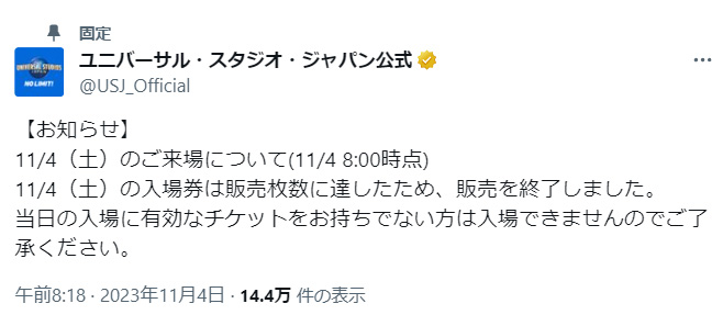 と言いたいところですが、今日のUSJの公式Xでは、今日、11月4日のワンデイチケットは完売したと書かれています。