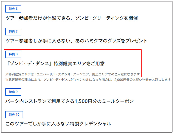 この中の4番「ゾンビ・デ・ダンス特別鑑賞エリア」は、グラマシーパークで開催されるハミクマというキャラクターが出てくる「ゾンビデダンス」の特別鑑賞エリアで見ることができる特典です。