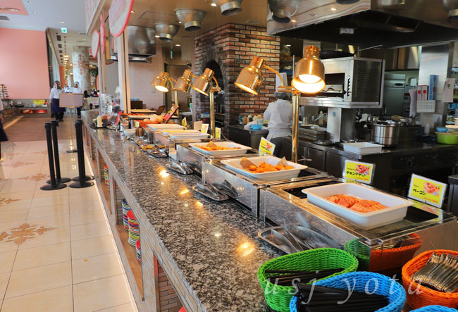 レストランが広いため、席数が多く、場所によっては、ずいぶん歩かないと目的のものが取れない席があります。