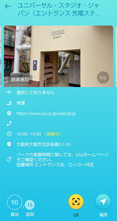 USJの2ヶ所にスマホの充電が切れたときに使える、モバイルバッテリーのレンタルサービスのスポットができました。