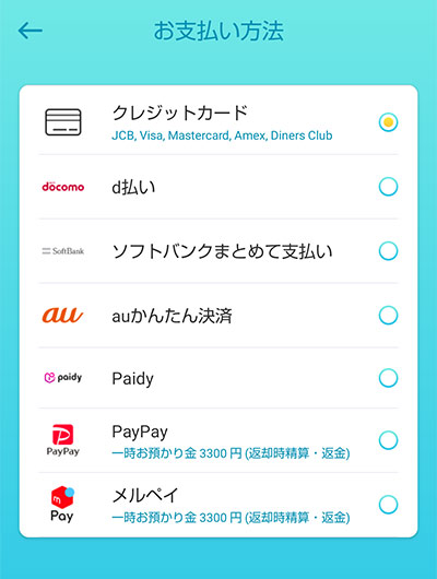 支払い方法は以下のように、クレジットカードやスマホ決済アプリです。
