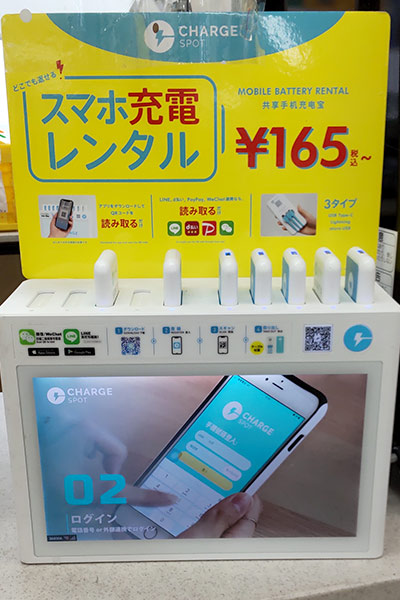 下の写真は、コンビニで見かけたチャージスポットのバッテリースタンドです。