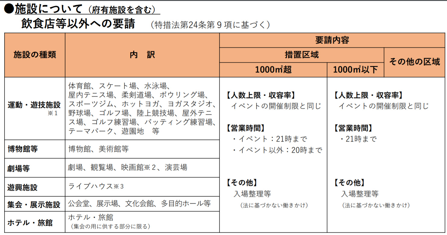 テーマパークが該当する部分は「飲食店等以外への要請:特措法第24条第9項に基づく」となっていて、イベントは21時、イベント以外は21時までの時短営業を要請されています。