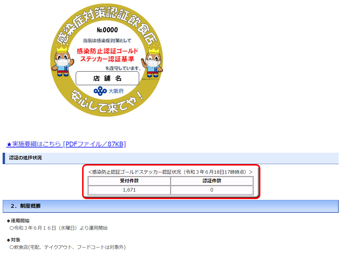 大阪府の「感染防止認証ゴールドステッカーについて」のページを見ると、6月18日17時の時点で、認証されている店舗は「0」となっています。