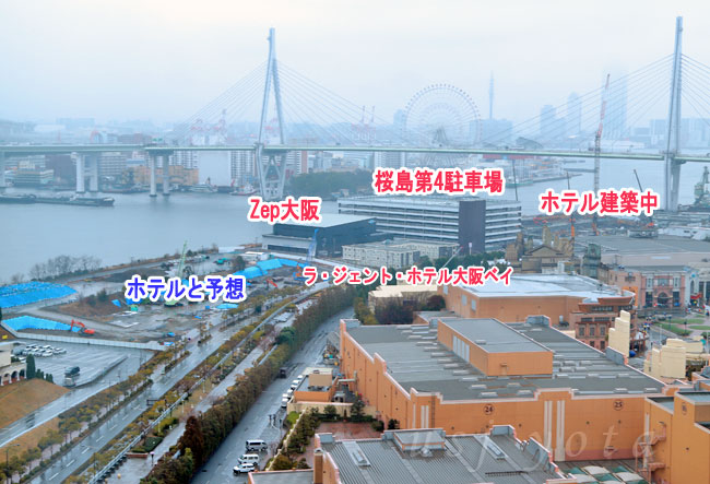ユニバーサルシティ駅から桜島駅の間その安治川沿いに連なる土地には現在、上の写真のように、駐車場、Zepp大阪、ホテルが出来上がっています。