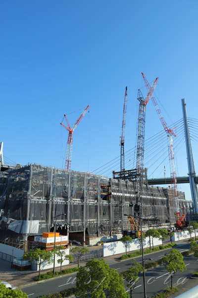 アームが伸びている場所は、桜島駅近くに建築中のホテル。